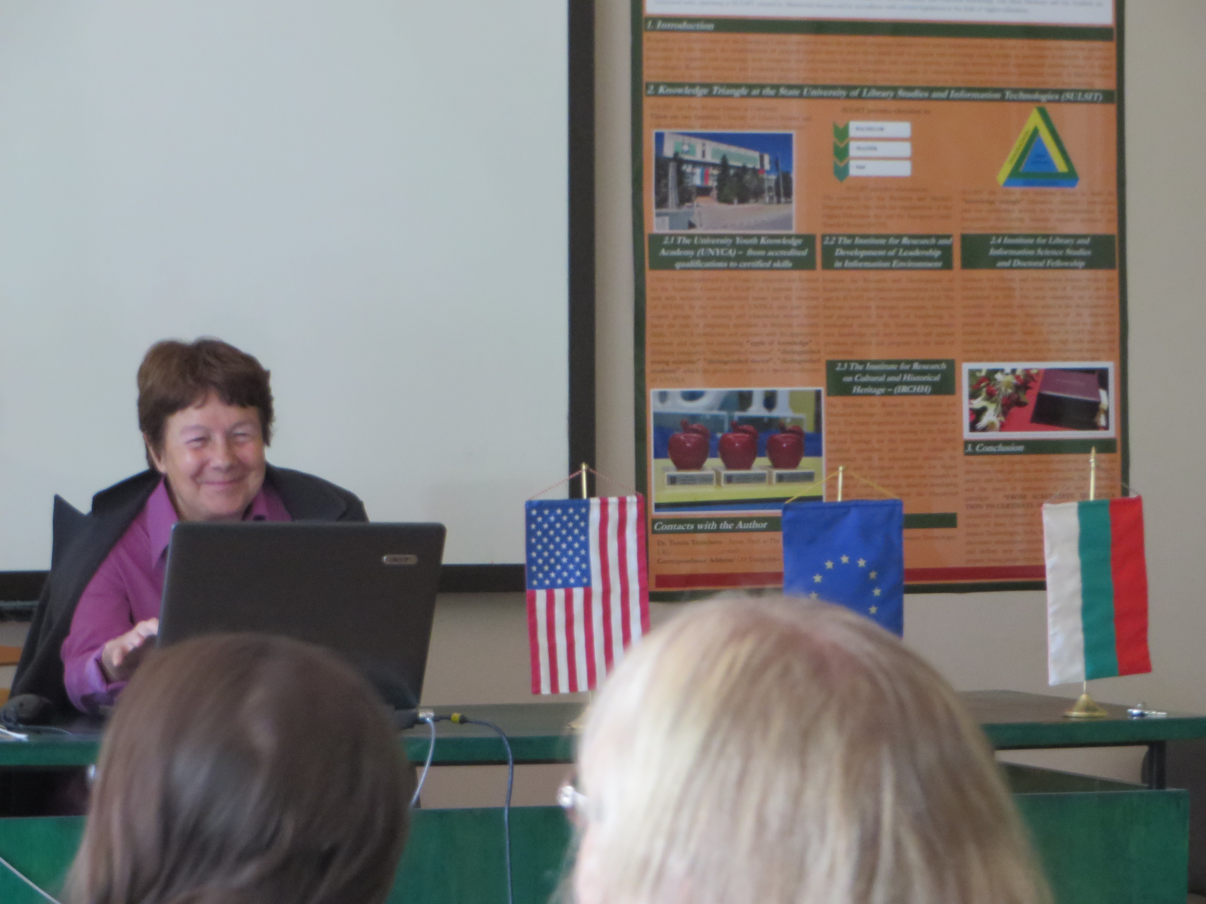 Experience/Learning: The state university library school was a campus that welcomed us warmly and showed us facilities and resources that are functional, bright, and professional. My thought during the formal presentations drifted to my own experience with active learning activities in my courses in the School of Library and Information Management. I hoped that this great Bulgarian library school knows teaching methods as powerful as what I have had in courses with Dr. Sutton, for example; but as the group of students chatted while the director settled into her PowerPoint, I had the thought that newer teaching and presentation methods are born from particular programs or from library instruction articles that get translated into Bulgarian. I hope we can help share ideas for innovative teaching methods with our Bulgarian library school counterparts while respecting the traditions and development occurring in two different countries. Perhaps student exchanges are the best approach.