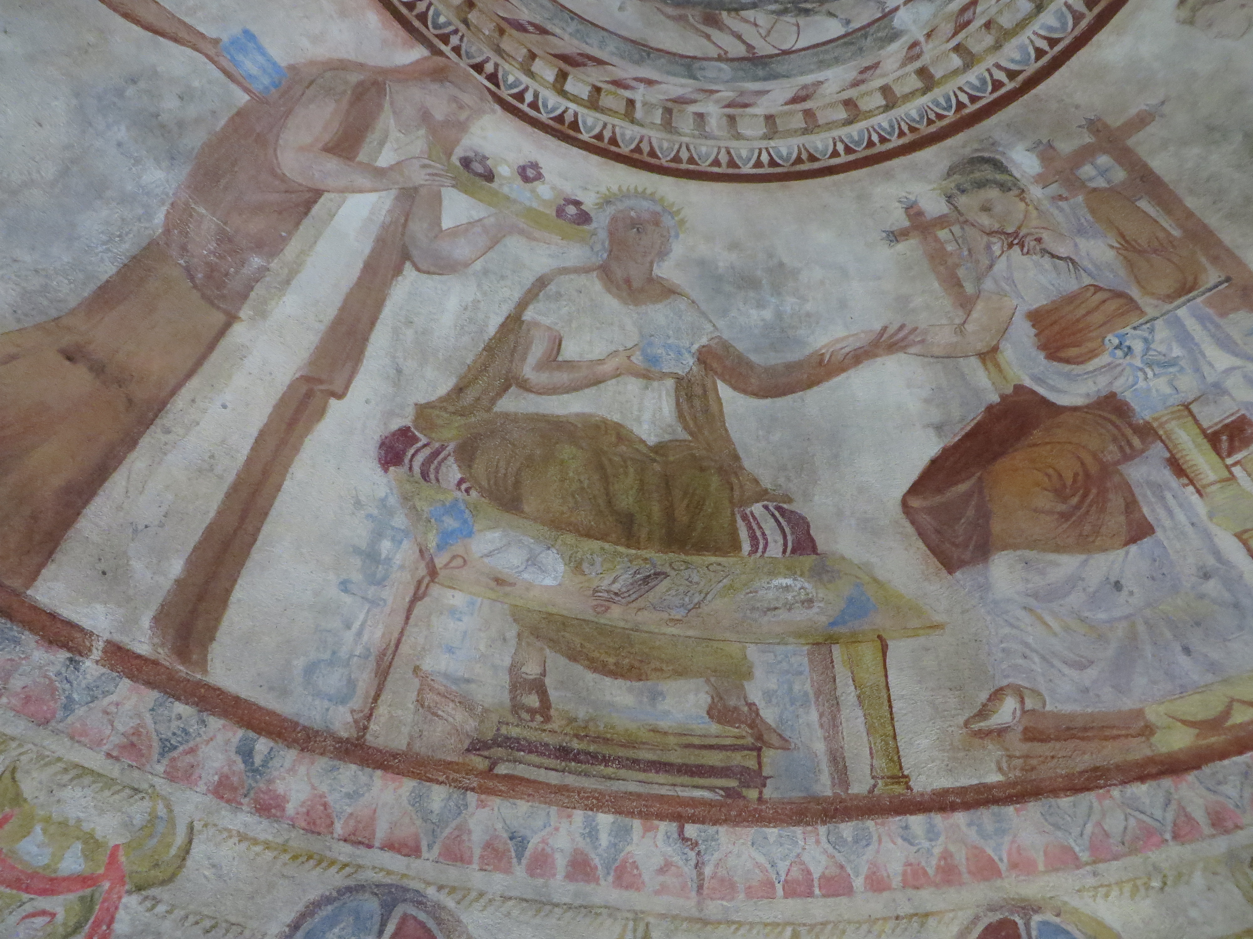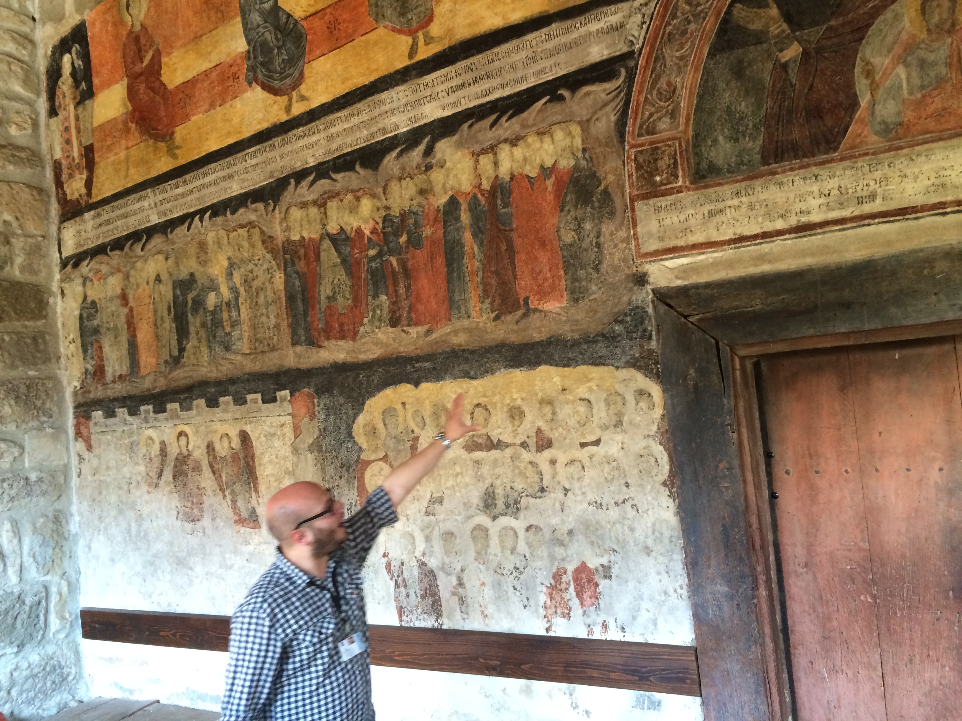 History/Culture: The Turkish reign has lasting reminders in the churches. Details of the faces in the frescoes here at St. Stefan were rubbed out since human representation was not allowed in sacred spaces. This may be just one of many motivations for Bulgarians interest and enjoyment of their culture heritage. The churches are mostly skeletons, but St. Stefan is enclosed, secured, and has frescoes which are being protected. “Prayers” for ships were line drawings of particular ships scratched into the decorative plaster tiles in the rear of the church.