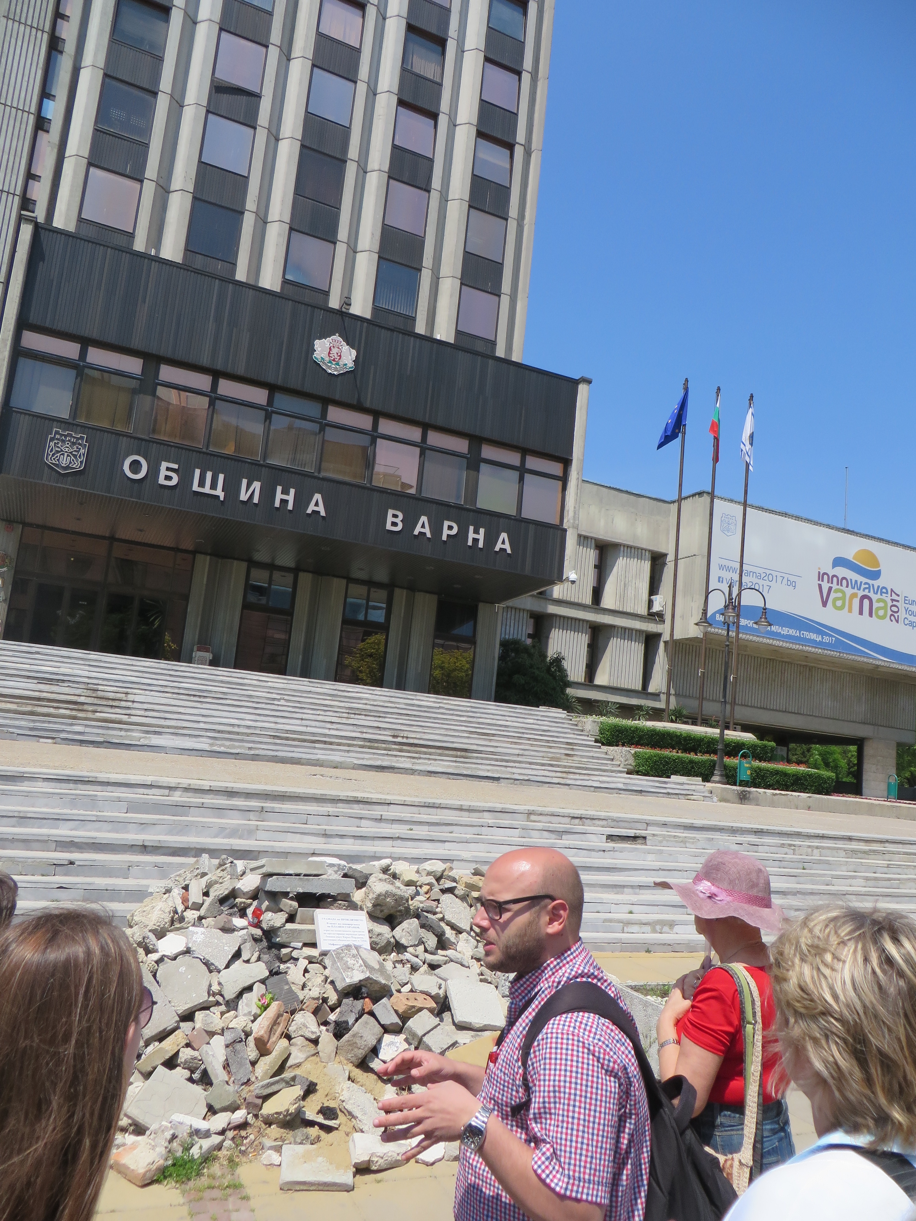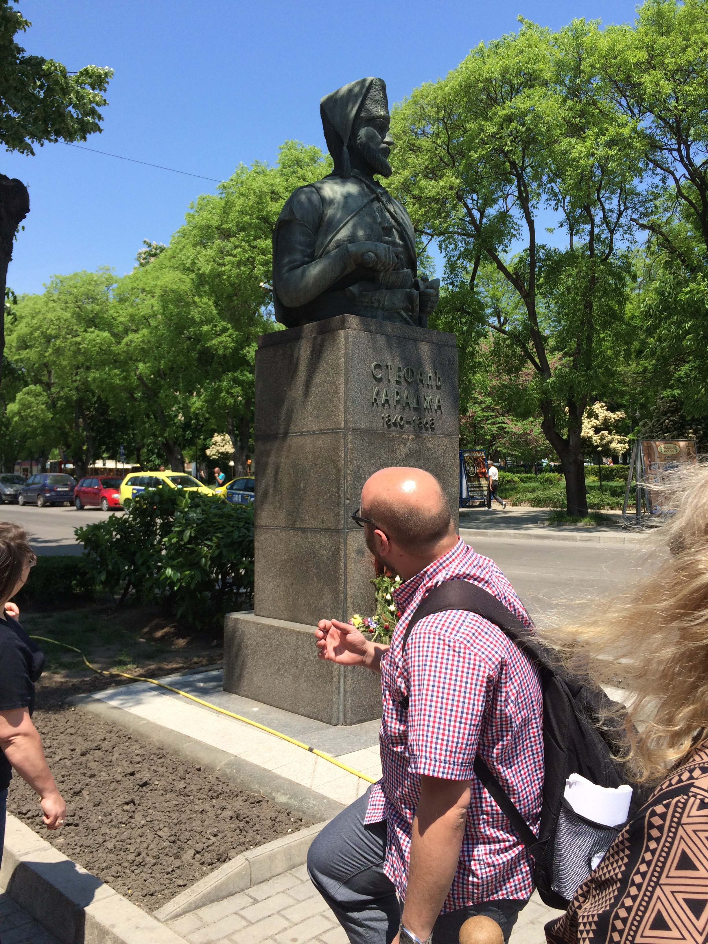 Learning/History/Bulgaria and the U.S.: The city tour of Varna was eye opening to the stark realities of politics in Bulgarian life and the resilience of Bulgarians through humor. The monument to Stefan Karadzha is a testament to his courage in attempting an invasion of his own country under Turkish rule at the time and his sacrifice by execution when it failed to return the government to Bulgaria. The rectangular monument on a mound of stones in front of Varna City Hall tells a story equally stark and far more recent: after the apathetic mayor of Varna refused to resign after public request, including a curse in the form of stone on top of stone put by individual citizens, a young man Plamen Goranov set himself on fire in desperate protest. He died in his hospital bed days later, but achieved his goal: the mayor resigned and city projects began again. This was three years ago, in 2012. The mound remains after an attempt to remove it erupted in protest. As for resilient Bulgarian humor, the monolithic cement monument to Bulgarian Soviet friendship during World War 2 on a hill outside Varna is referred to as “Grannies Panties,” for Tsola Dragoicheva, a female active in Party membership into her 90s.