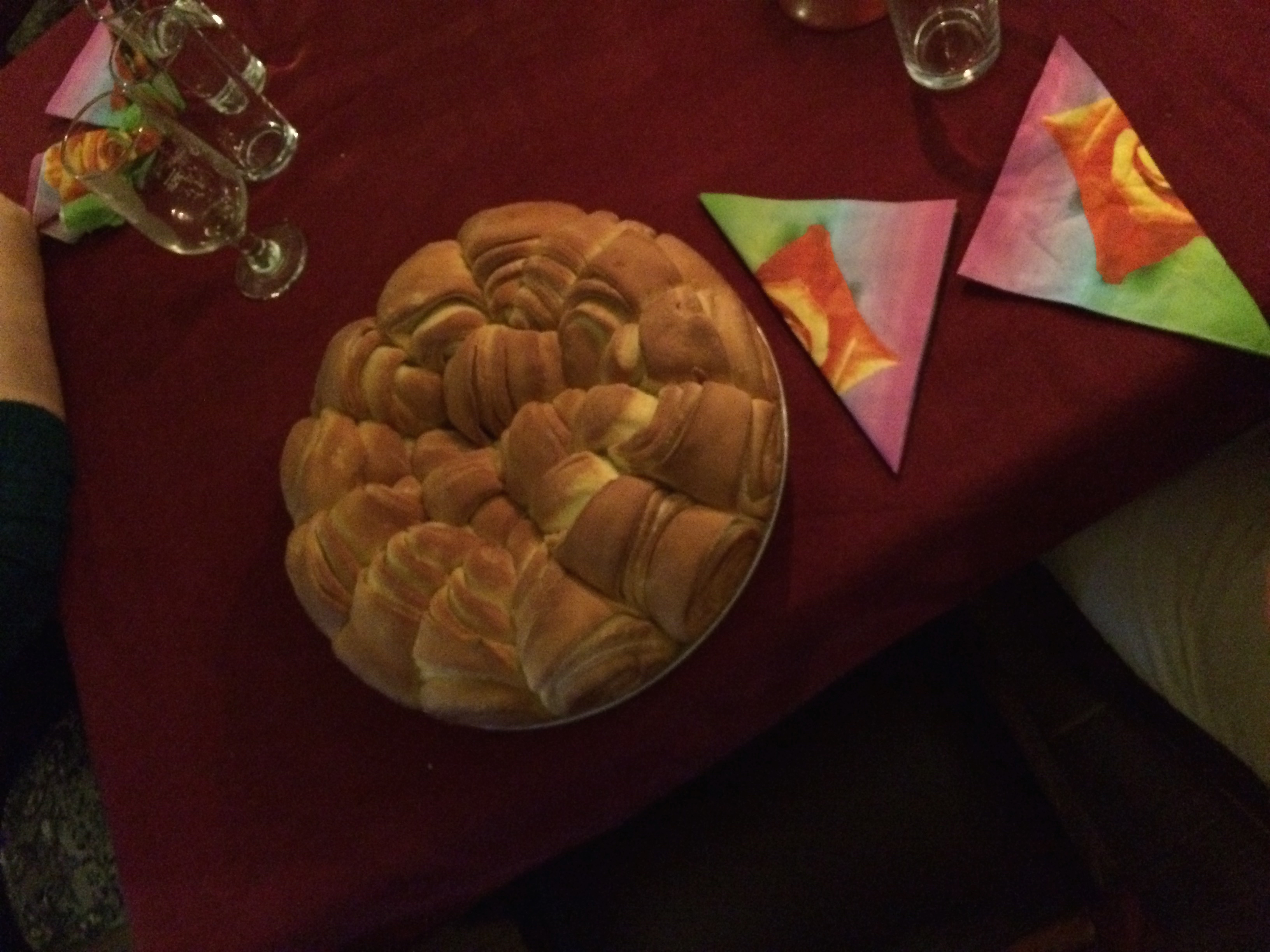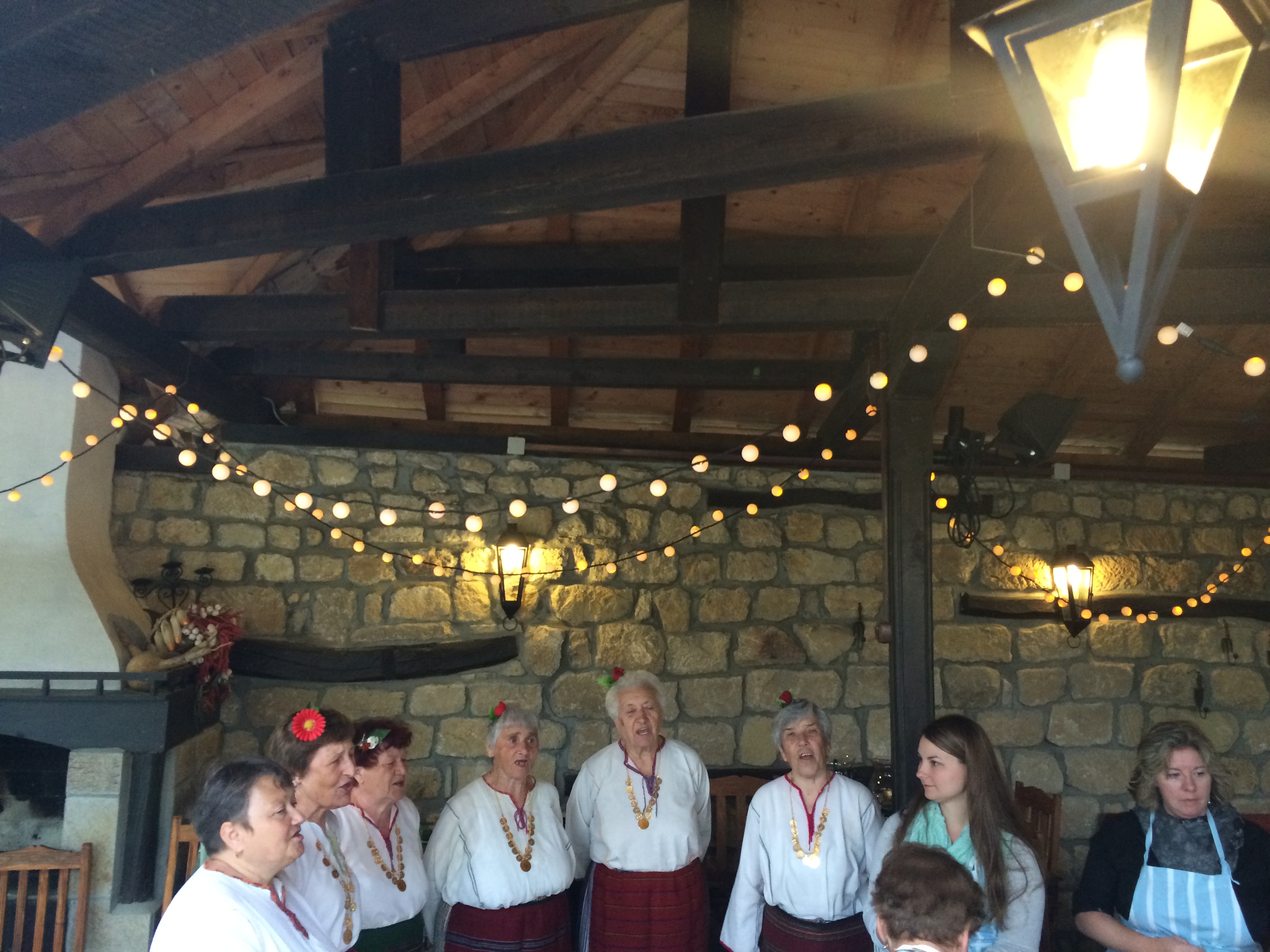 Culture: In a spectacular finish to our momentous first day, we walked to dinner across a plaza quite similar to Roman plazas, with large squares of smooth stone, with archeology digs in process on our left and our right, hills with trees and homes rise nearby. Our tour guide Stefan had chosen a restaurant to help us appreciate Bulgarian hospitality. The traditional cloth and the open beamed room with a wood fired oven in a visible, but enclosed, room nearby helps us appreciate the warmth of traditional food and conversation among new friends. We also help Stefan celebrate his birthday: he buys us each a drink of rakia and we raise a glass to him. He also gets to see some friends who drive from Sofia to see him at the restaurant. We left them there after our dinner to celebrate further among old friends.