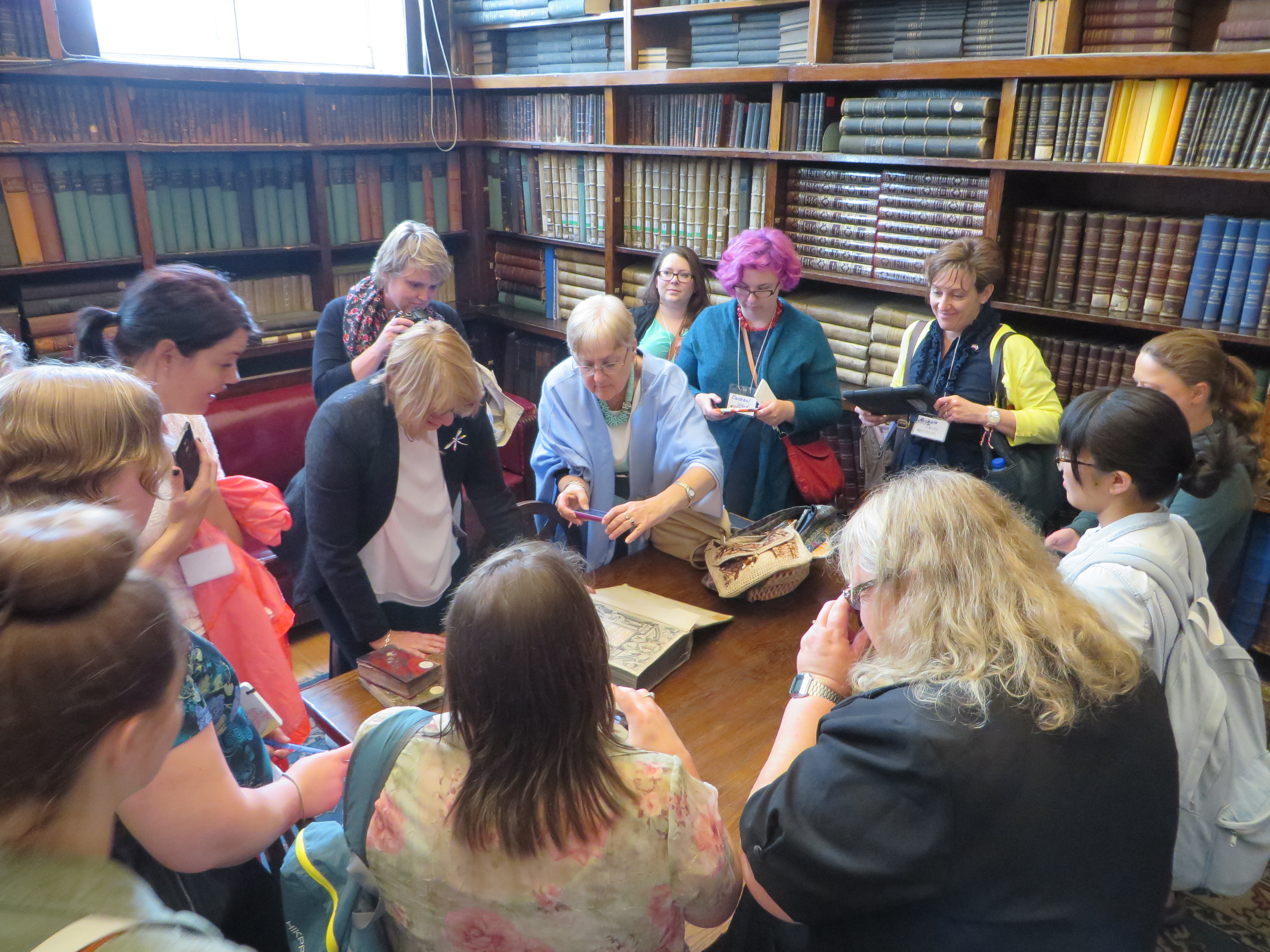 Learning: Beautiful to be part of National Library Week celebration. The National Library has an impressive building and great spaces to display and access its collection. The preservation department on a top floor showed both room and personnel teams to address the needs of the collection. Team composition seemed related to age and skills/areas of experience. We were invited to the party of appreciation for the library employees: glasses were raised on this “day off” and treats were served in a portrait gallery hallway.
