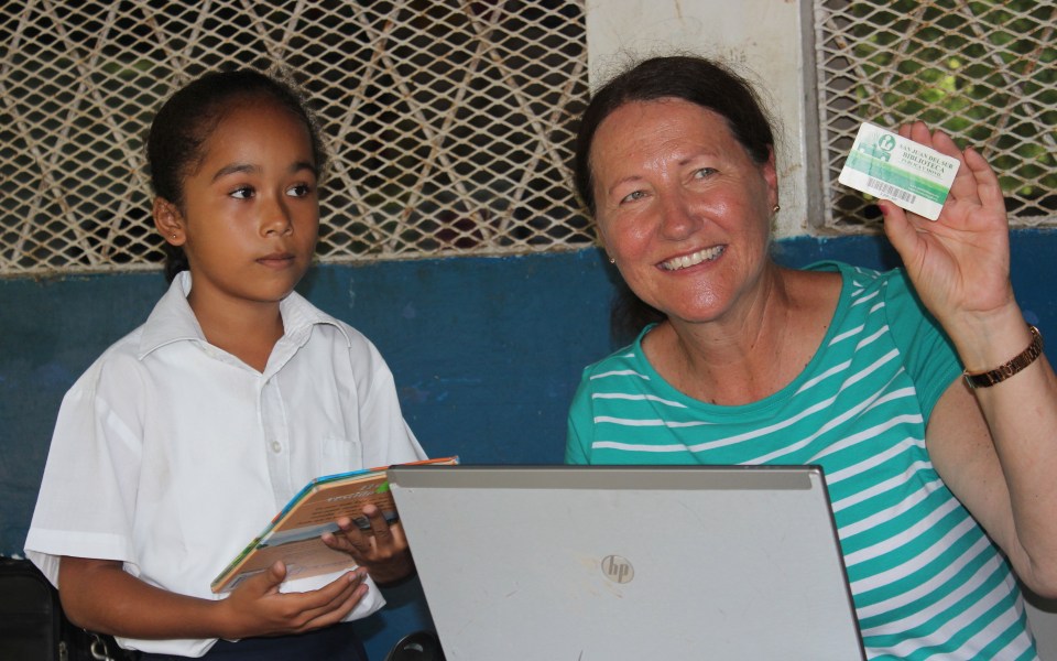 kathy with girl and library card