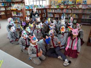 The last two days were spent working with the students. Before coming into the library, everyone must take off their shoes (adults, too!). Some of the activities included a using a flannel board with a desert habitat, singing animal songs, and making animal masks (for the younger students) and origami, a word search, and “name the animal” for the older students.