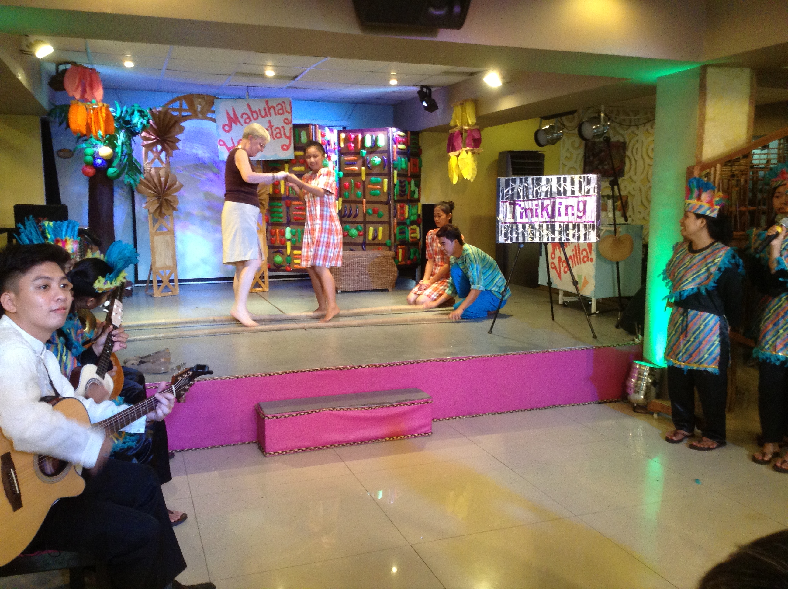Nancy presenting a Native American rattle to the Director of the University of the Philippines Library System, Rodolpho Tarlit.